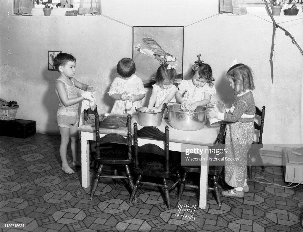 [Wisconsin Historical Society. Five Children Washing Dishes at the Dorothy Roberts Nursery School. 1933.]